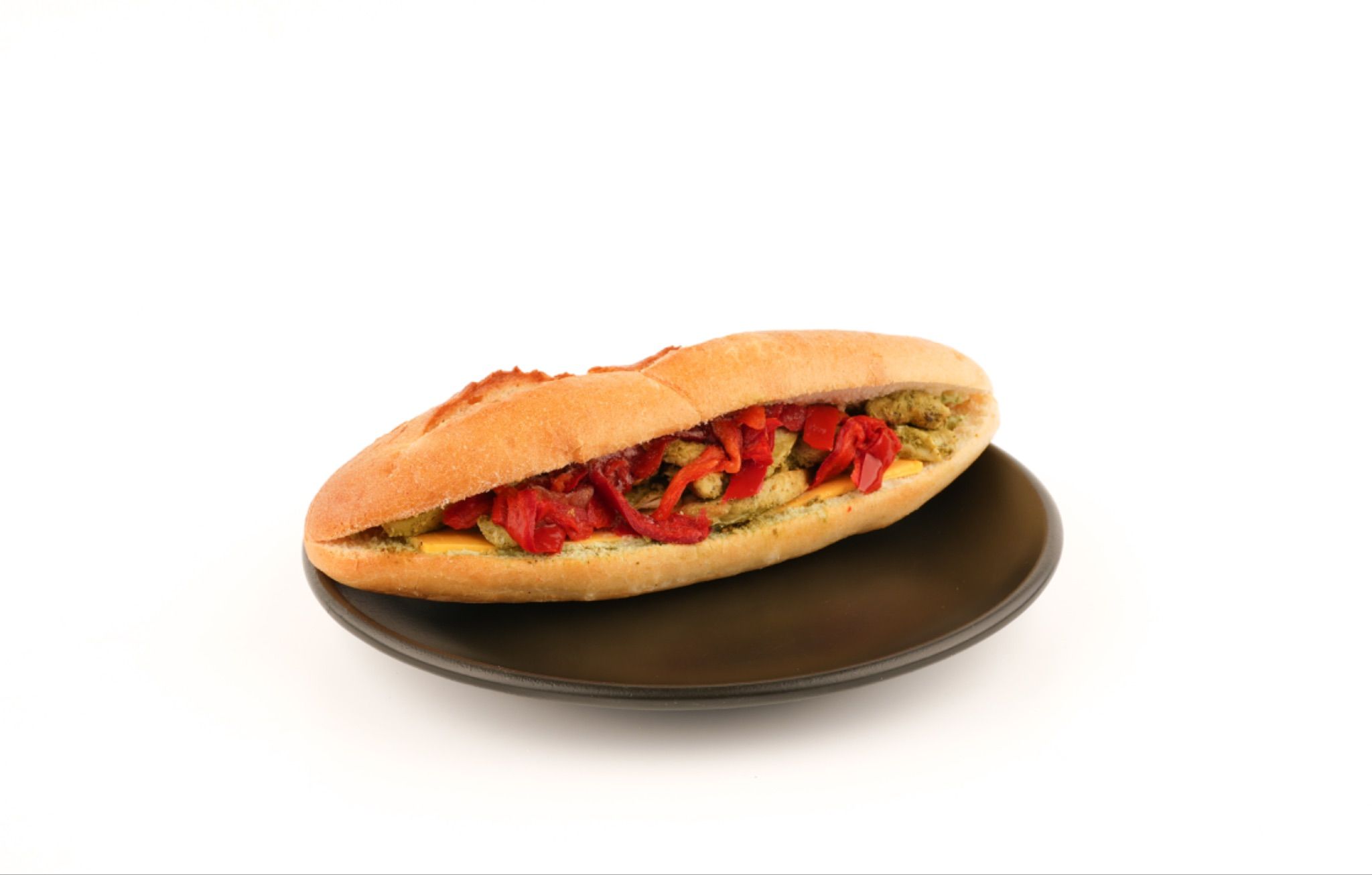 Izgara tavuğun pesto sosla buluştuğu bu sandviçte, fırınlanmış kapya biber ve cheddar peyniri lezzeti tamamlar. Hepsi taze baget ekmeği arasında bir araya gelir.