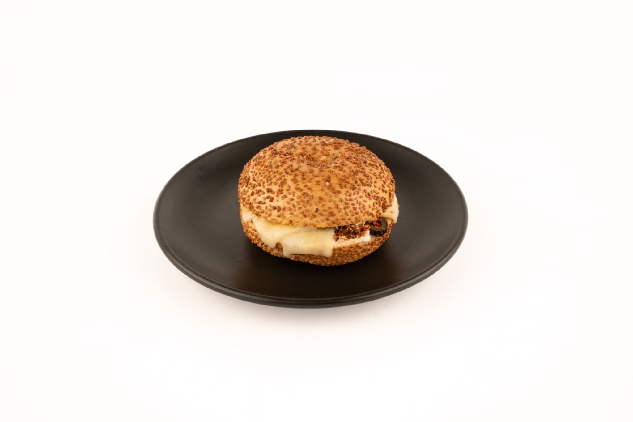 Taze peynir ve kaşar peyniriyle hazırlanan simit sandviç, kuru domates, siyah zeytin ve maydanozla zenginleşir; pesto sos ve parmesan dokunuşuyla lezzetini tamamlar.