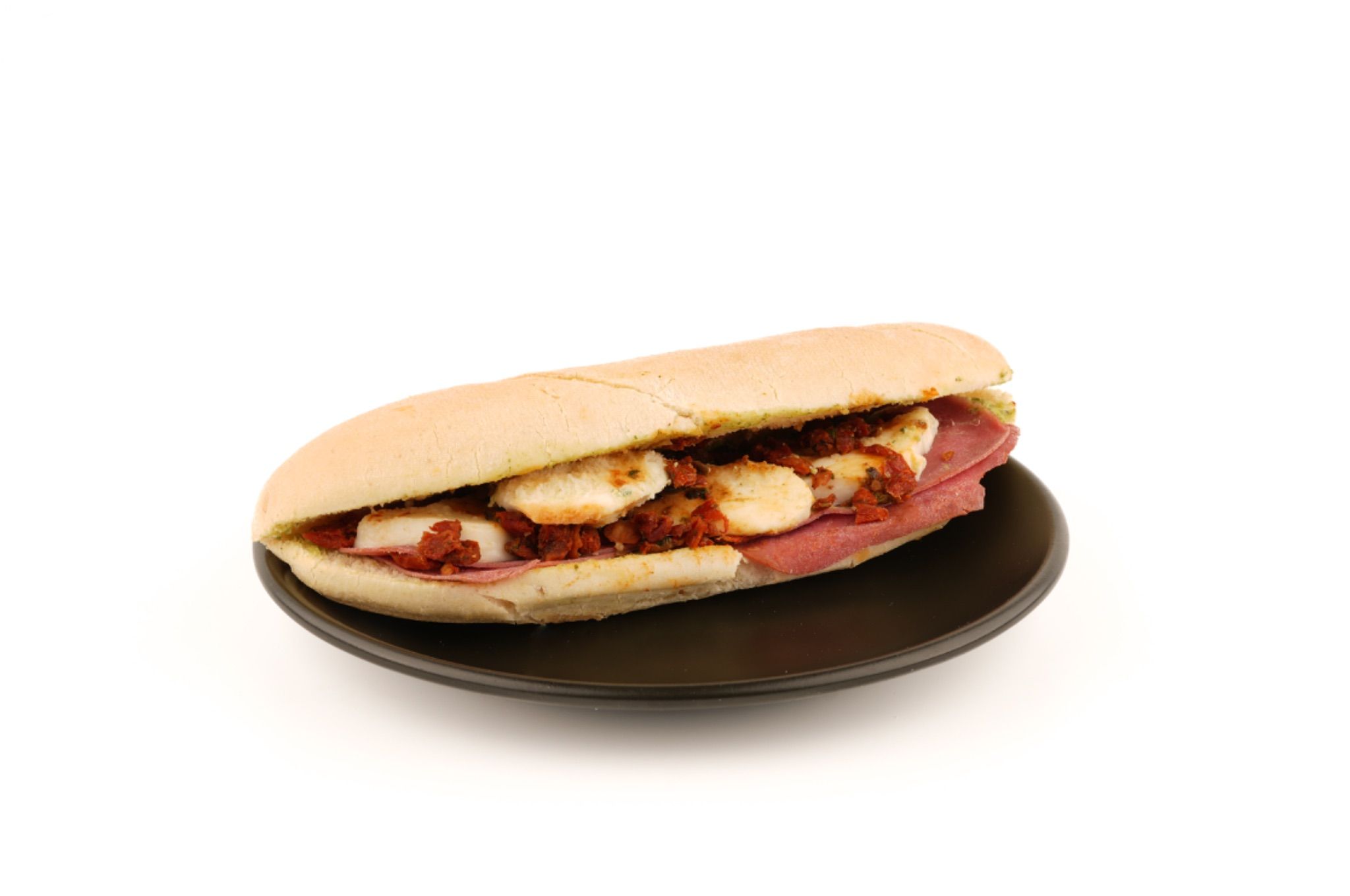 Sade baget ekmeğiyle hazırlanan bu sandviçte, dana jambon, mozzarella ve labne peyniri ile buluşur; zeytin, kuru domates ve maydanozla lezzet dengesi tamamlanır.
